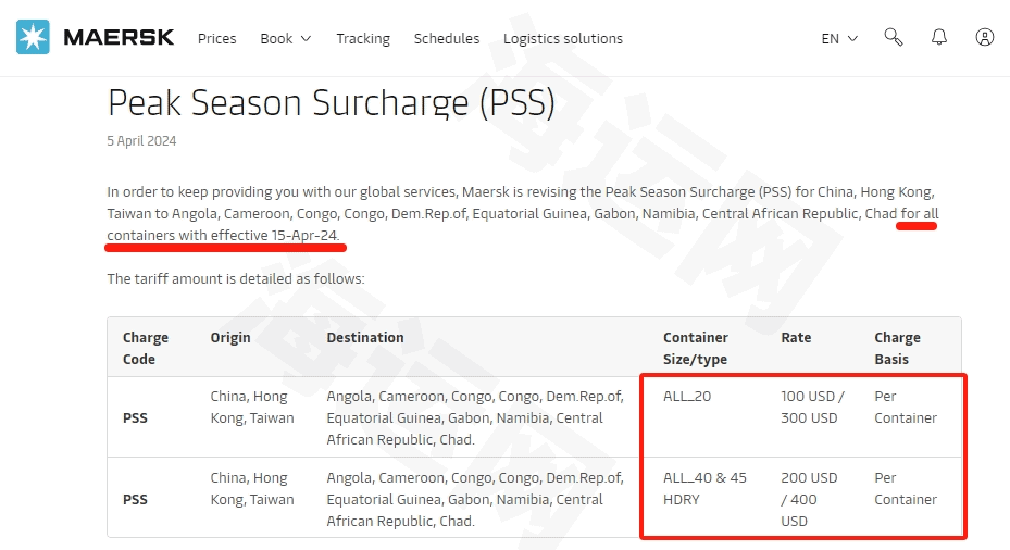 On April 5, Maersk’s official website released a notice adjusting the peak season surcharge (PSS) for all containers from the Greater China area, including Hong Kong and Taiwan, to Angola, Cameroon, Congo, Democratic Republic of the Congo, Equatorial Guinea, Gabon, Namibia, Central African Republic, and Chad, effective from April 15, 2024.