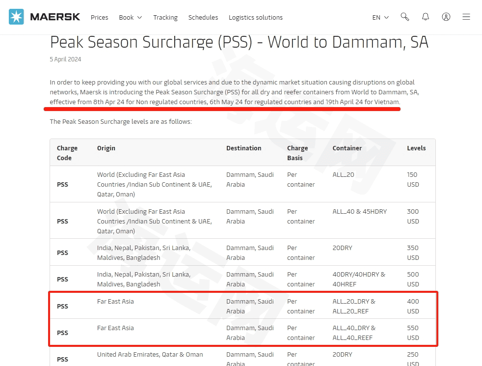 Simultaneously, Maersk’s official website issued a notice stating that due to dynamic market conditions leading to disruptions in the global service network, Maersk will implement a peak season surcharge (PSS) for all dry and reefer containers from around the world to Damman, Saudi Arabia. This will become effective on April 8 for non-controlled countries, on May 6 for controlled countries, and on April 19 for Vietnam. The surcharge for Far East to Damman is $400 for 20-foot dry and reefer containers; and $550 for 40-foot dry and reefer containers.