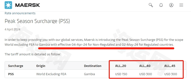 On April 5, Maersk released a notice announcing the imposition of a peak season surcharge (PSS) for several African countries, Kenya, Gambia, and Damman, Saudi Arabia.
