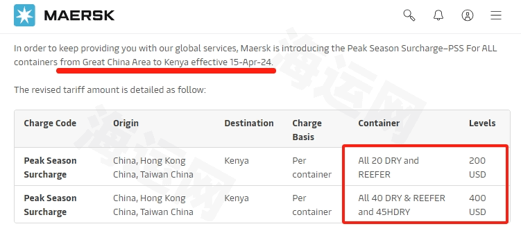 On April 5, an announcement on the Maersk official website stated that a peak season surcharge (PSS) will be introduced for all containers from the Greater China area, including Hong Kong and Taiwan, to Kenya, effective from April 15, 2024. The adjusted surcharge rates are as follows: $200 for both 20-foot dry containers and reefer containers; and $400 for both 20-foot high cube reefer containers and 45-foot dry containers.