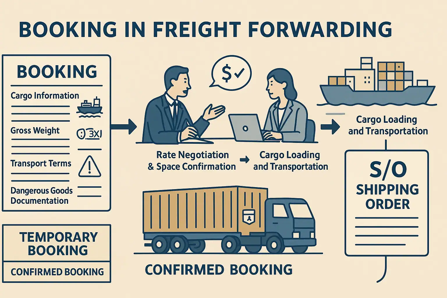 In freight forwarding, a Booking refers to a booking request or a letter of authorization. It is the process where the consignor or their agent