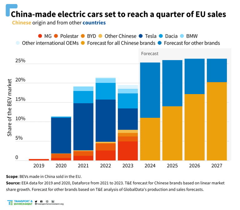 Despite the fact that a significant portion of the cars exported from China to Europe are from Tesla, Dacia, and BMW, Transport & Environment predicts that Chinese brands will hold an 11% share of the European electric vehicle market in 2024, and this figure is expected to rise to 20% by 2027.