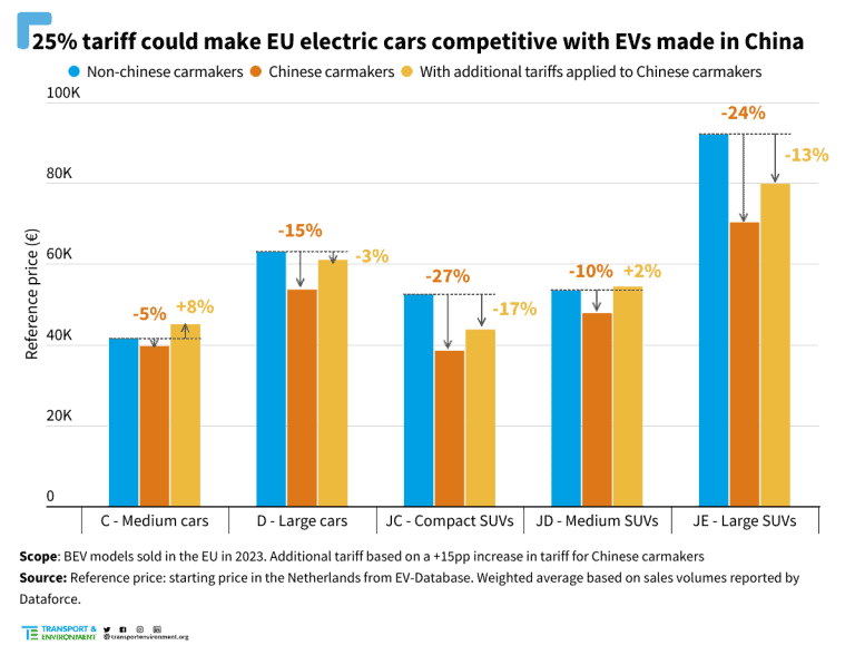 The report by Transport & Environment found that if the EU imposes a 25% tariff on all cars imported from China, mid-sized sedans and mid-sized SUVs from China would become more expensive than their European counterparts. However, under such tariffs, compact SUVs and larger vehicles imported from China are expected to remain slightly cheaper than similar European products.